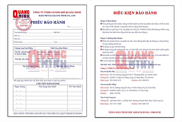 Đối với các ấn phẩm do Quang Minh phát hành, bao gồm cả ấn phẩm giới thiệu sản phẩm đến các ấn phẩm bảo hành, lưu trữ dữ liệu lắp đặt & thanh toán, đều có đầy đủ thông tin công ty. Các thông tin trên ấn phẩm cũng đều thống nhất, không có sự khác biệt.